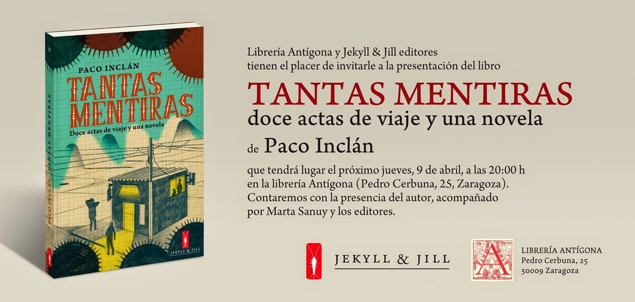 Es un placer anunciaros el próximo evento, que abre TANTAS MENTIRAS TOUR, la gira-presentación del libro de Paco Inclán, que tendrá lugar el próximo jueves, a las 20 horas en la Librería Antígona de Zaragoza.